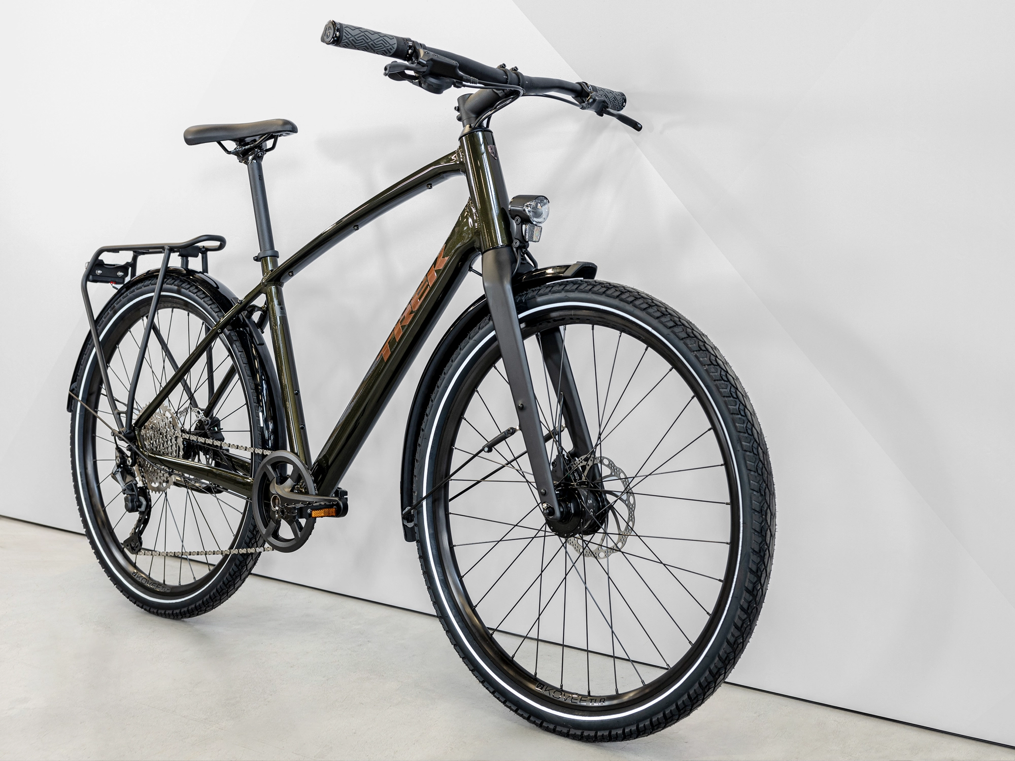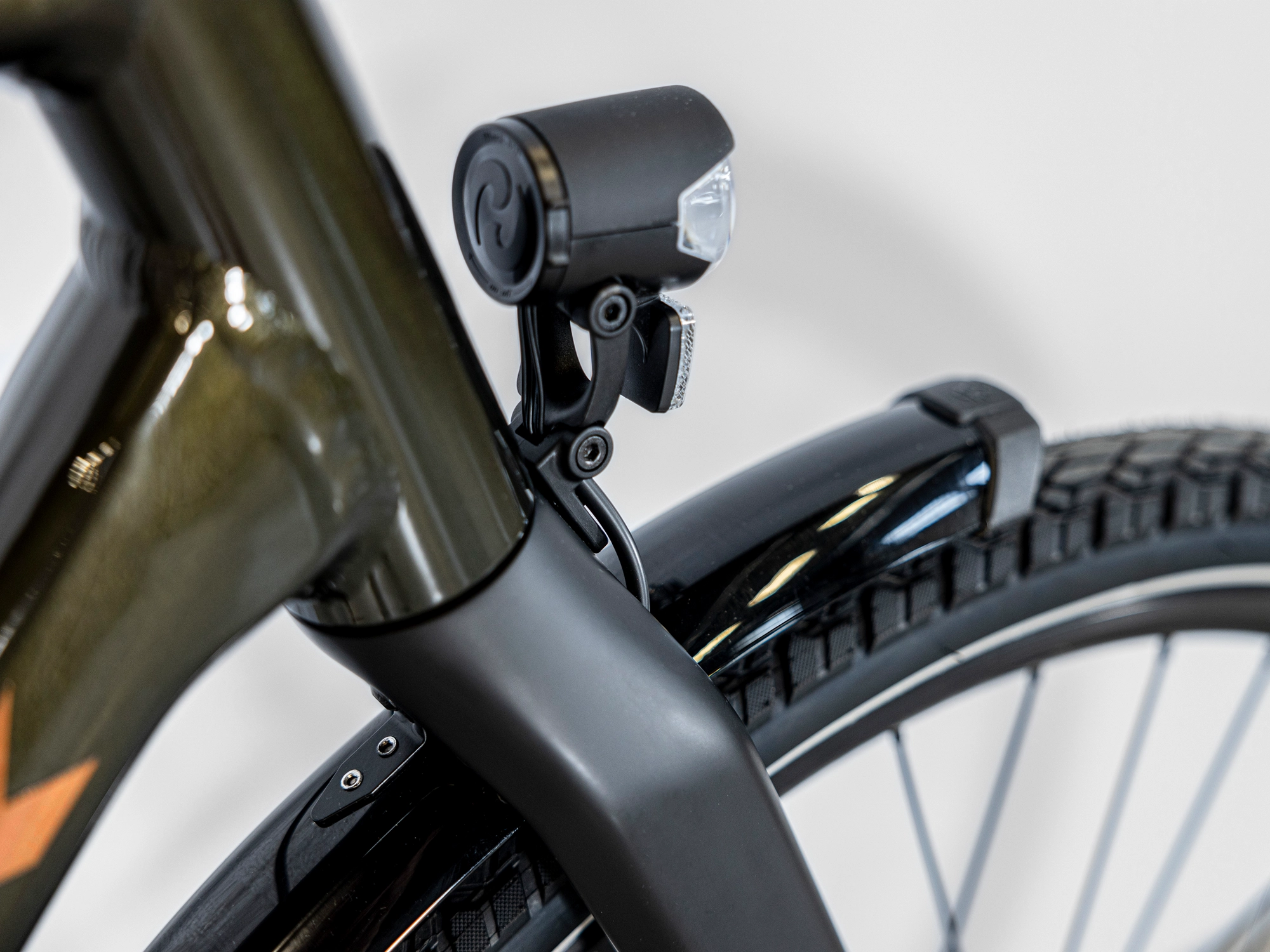 Einen leichten Aluminiumrahmen mit interner Zugführung für einen sauberen Look, eine leichte Carbongabel, Bontrager Kovee Tubeless Ready 650B-Laufräder mit breiten 50C-Reifen zur Verbesserung der Geländegängigkeit und des Komforts in abwechslungsreichem Terrain und eine einfach zu bedienende, umwerferlose Shimano Deore 1×10-Schaltung. Aber keine Sorge: Mit der breiten Übersetzungsspanne der 11-46-Kassette stehen dir mehr als genug Gänge für deftige Anstiege und rasante Abfahrten zur Verfügung. Dazu bekommst du einen Nabendynamo zur Stromversorgung der Beleuchtung, kraftvoll zupackende Scheibenbremsen, ergonomische Griffe, Schutz