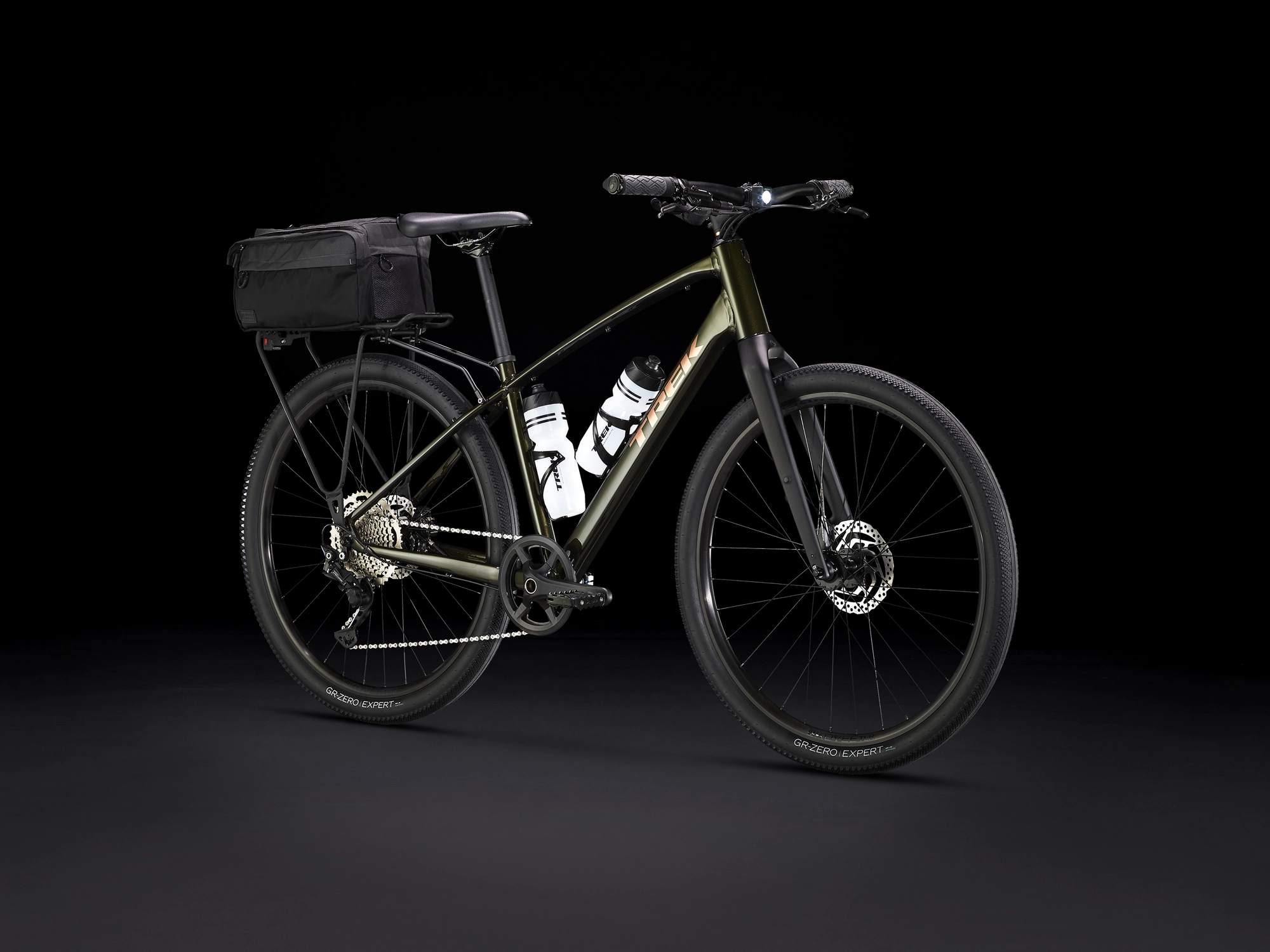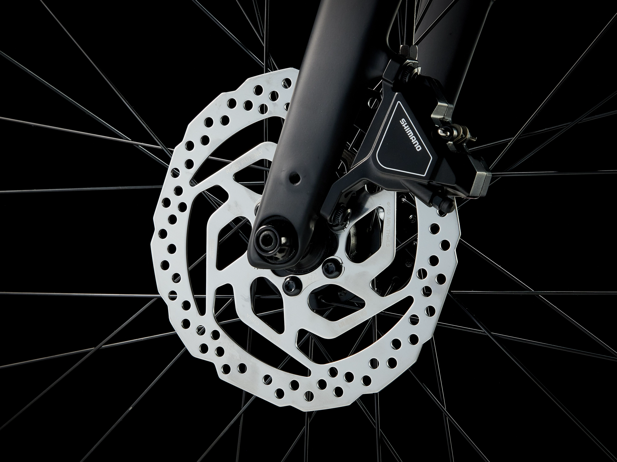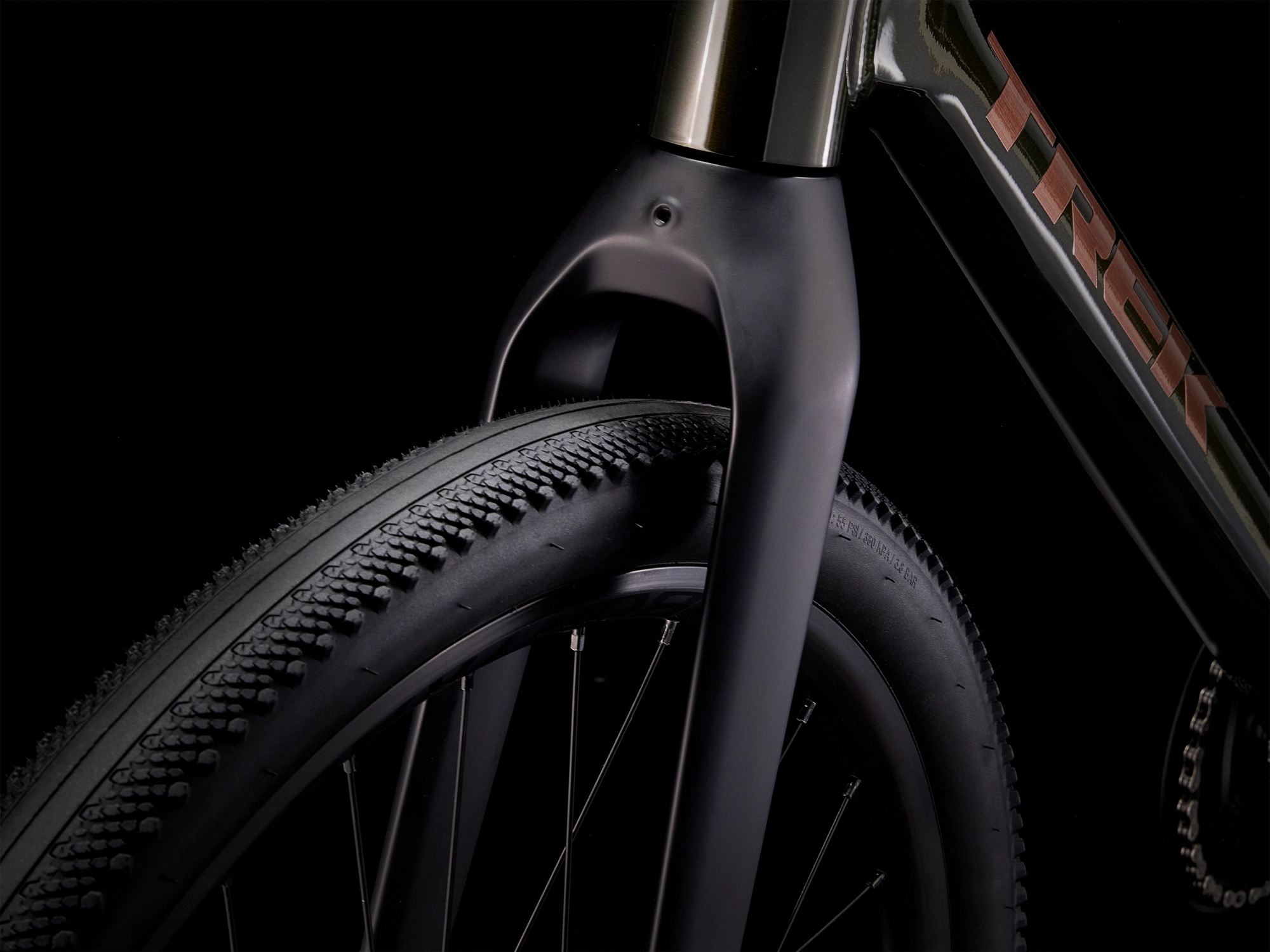 Einen leichten Aluminiumrahmen mit interner Zugführung für einen sauberen Look, eine leichte Carbongabel, Bontrager Kovee Tubeless Ready 650B-Laufräder mit breiten 50C-Reifen zur Verbesserung der Geländegängigkeit und des Komforts in abwechslungsreichem Terrain und eine einfach zu bedienende, umwerferlose Shimano Deore 1×10-Schaltung. Aber keine Sorge: Mit der breiten Übersetzungsspanne der 11-46-Kassette stehen dir mehr als genug Gänge für deftige Anstiege und rasante Abfahrten zur Verfügung. Dazu kommen kraftvoll zupackende Scheibenbremsen und Aufnahmen für einen Gepäckträger und Schutzbleche.