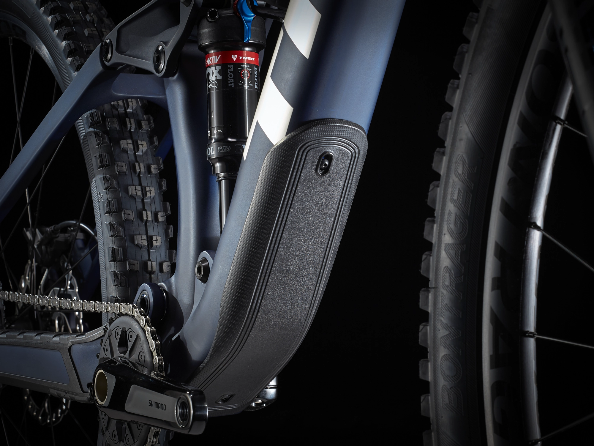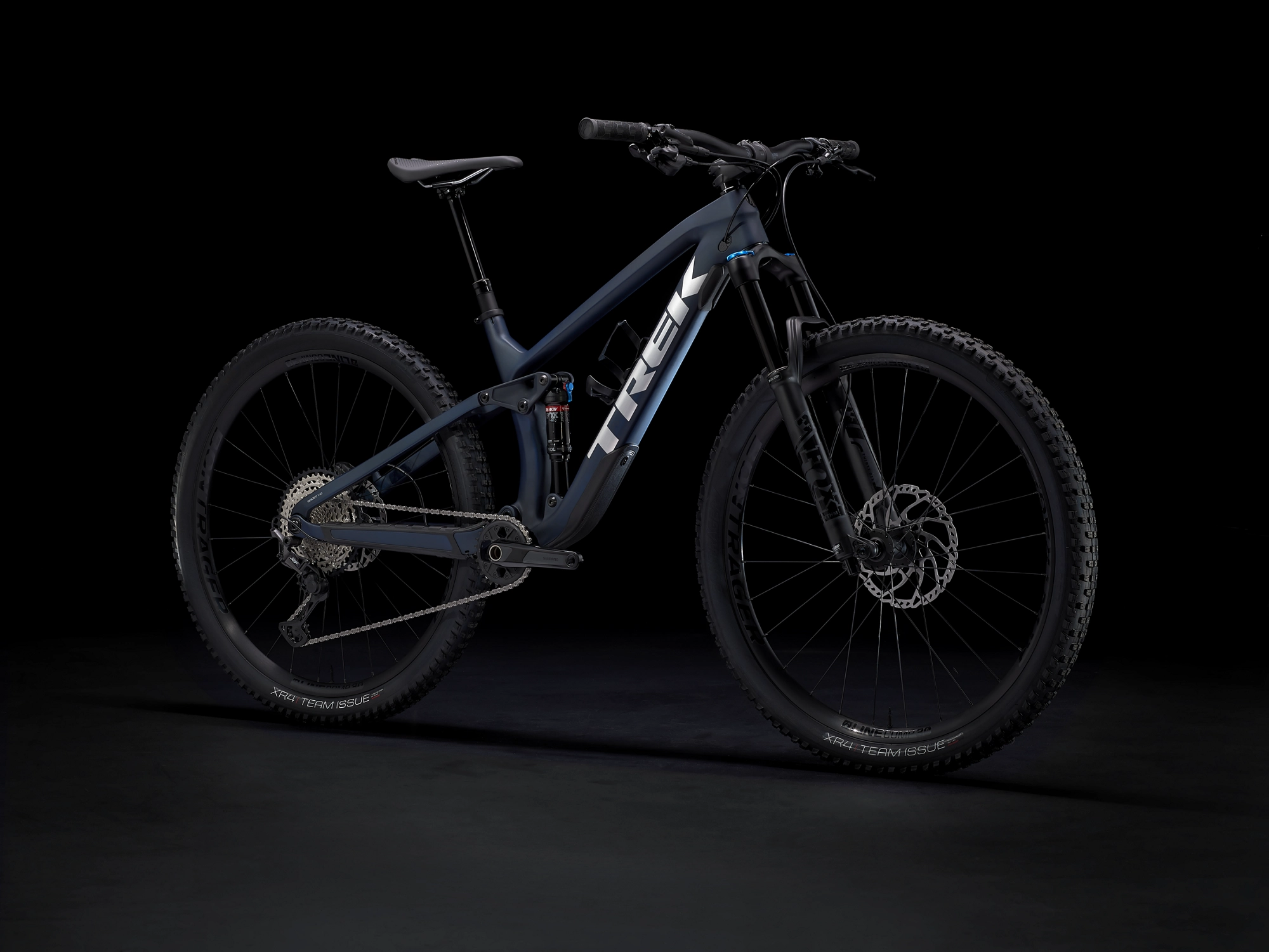 Einen leichten, steifen Rahmen aus OCLV Mountain Carbon mit integriertem Staufach, eine FOX Rhythm 36-Gabel mit 140 mm Federweg, einen FOX Float Performance-Dämpfer mit 130 mm Federweg und Treks effizienter RE:aktiv-Technologie, einen Shimano SLX/XT 1×12-Antrieb mit breitem Übersetzungsbereich, Line Comp 30 TLR-Laufräder samt Rapid Drive-Hinterradnabe mit 54 Zähnen, Bontragers Line-Variosattelstütze und kraftvoll zupackende hydraulische 4-Kolben-Scheibenbremsen von Shimano.