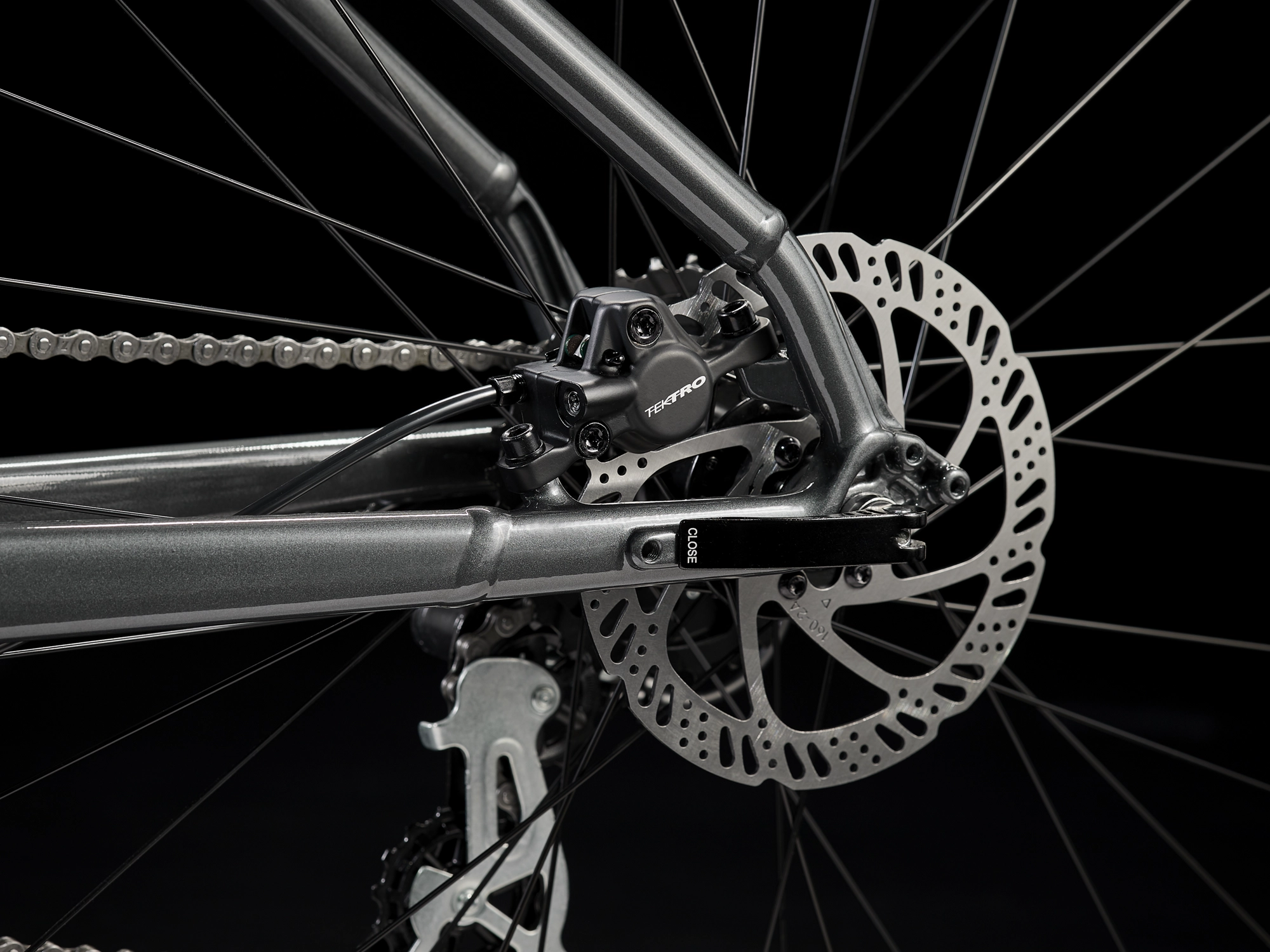 Einen leichten Aluminiumrahmen mit interner Zugführung zum Schutz der Schaltzüge und für einen sauberen Look sowie einen 2×8-Antrieb mit breitem Übersetzungsbereich, damit dir in jedem Terrain stets der richtige Gang zur Verfügung steht. Dazu gibt es kraftvoll zupackende hydraulische Scheibenbremsen und eine Federgabel mit Lockout, die Unebenheiten souverän entschärft.