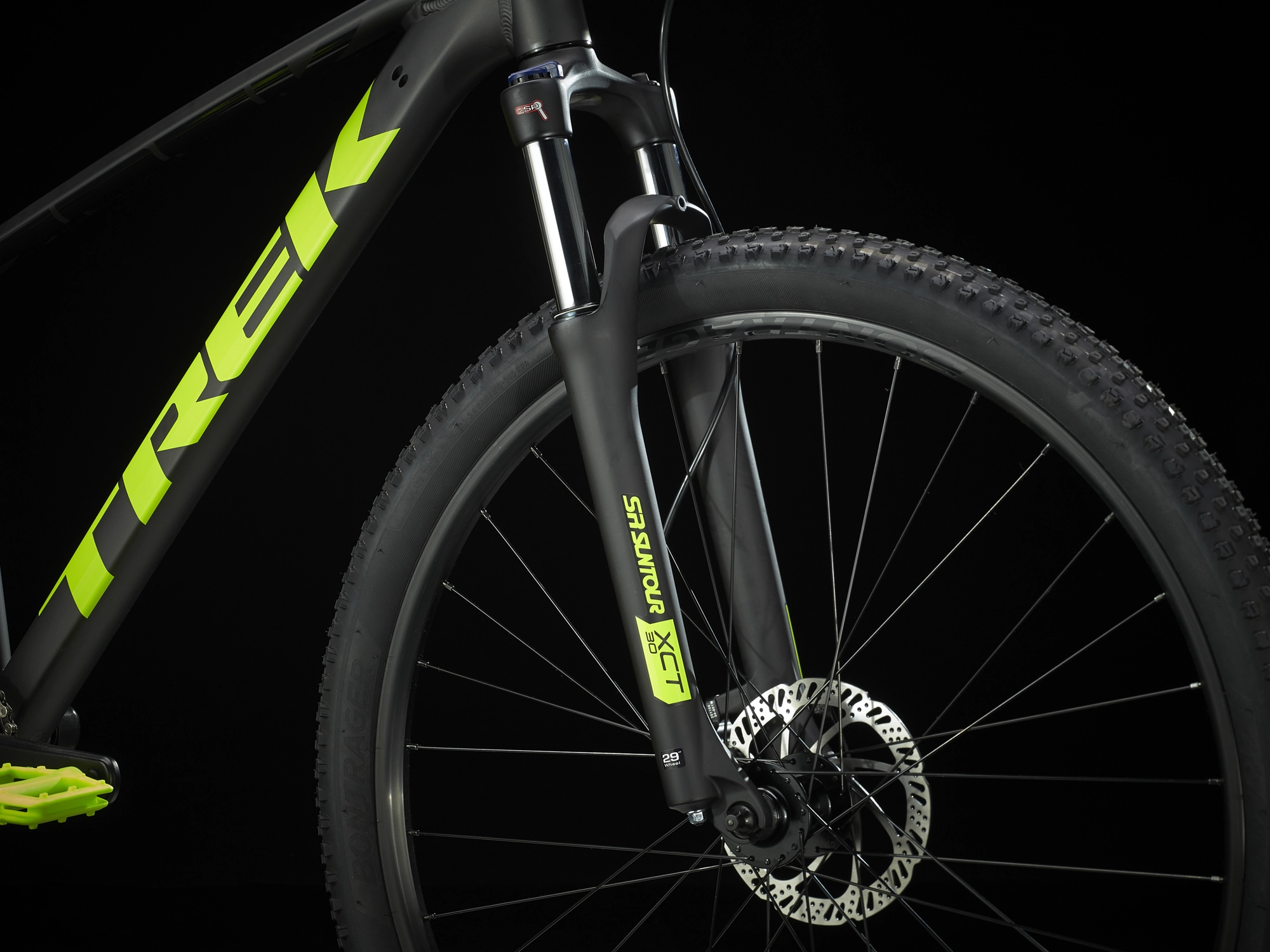 Gabel: SR Suntour XCT 30, Spiralfeder, verstellbare Federvorspannung, hydraulischer Lockout, 46 mm Vorbiegung für 29″-Laufrad, 100-mm-Schnellspannachse, 100 mm Federweg