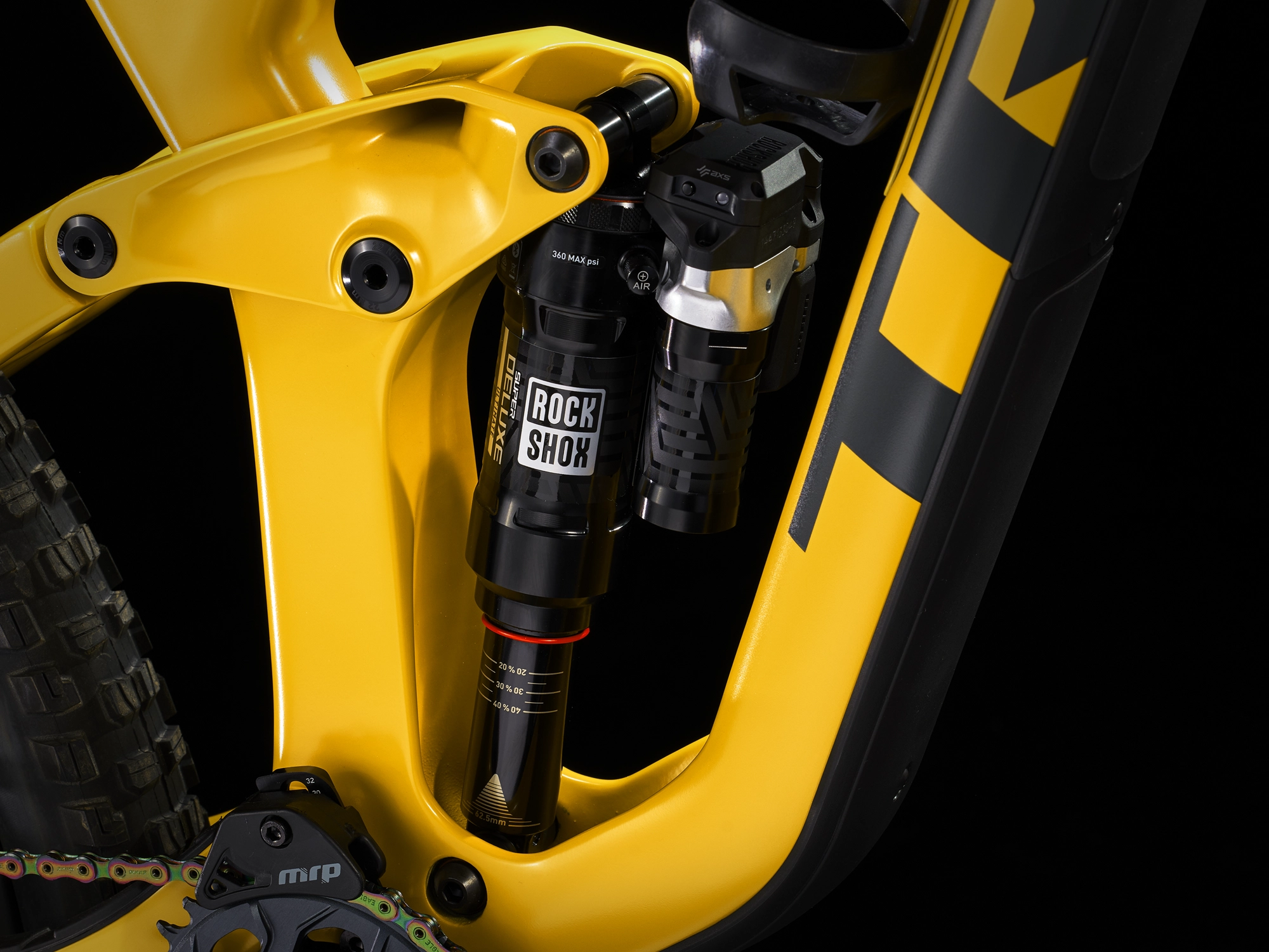 Einen Rahmen aus OCLV Mountain Carbon mit 160 mm Federweg, einen RockShox Super Deluxe Ultimate-Dämpfer und eine RockShox ZEB Federgabel mit bulligen 38-mm-Standrohren und automatischer Flight Attendant-Technologie. Außerdem kommt es mit einem SRAM XX1 Eagle 12x-Antrieb, einer integrierten Bontrager RSL-Lenker/Vorbau-Einheit und Bontrager Line Pro 30-Carbonlaufrädern samt Rapid Drive-Hinterradnabe mit 108 Zähnen für eine verzögerungsfreie Beschleunigung in den entscheidenden Momenten.