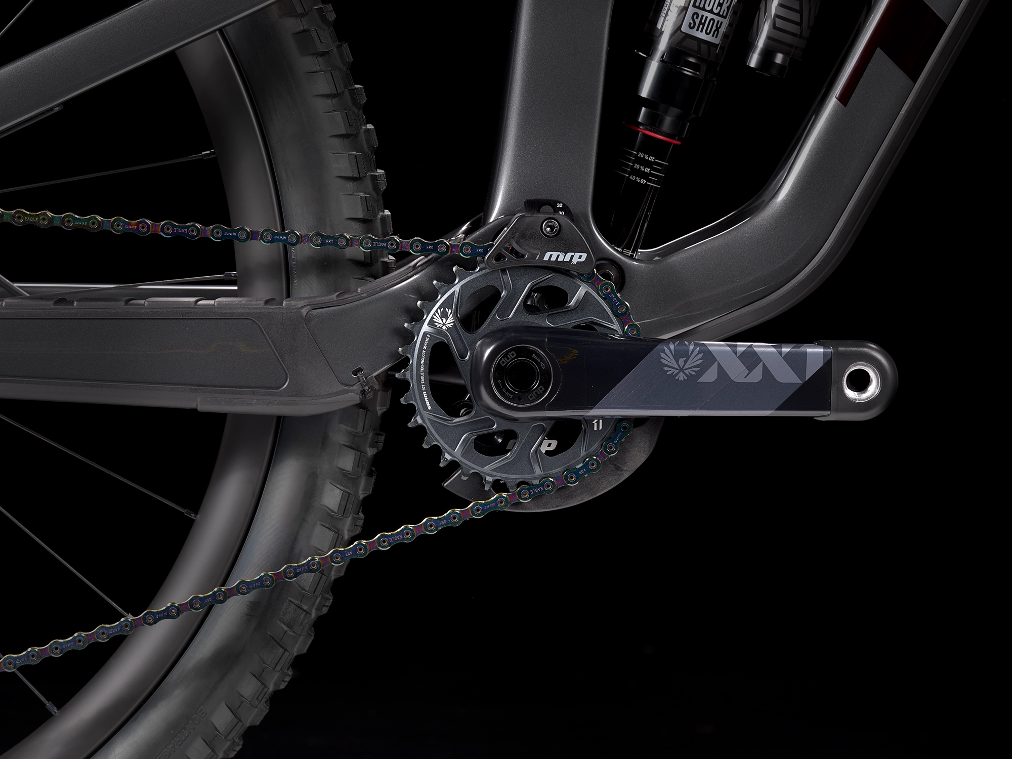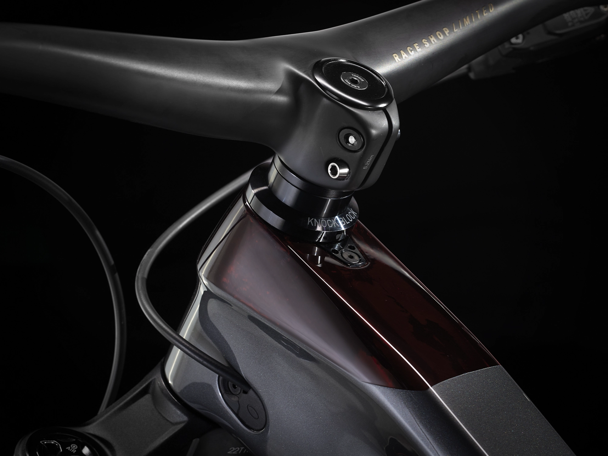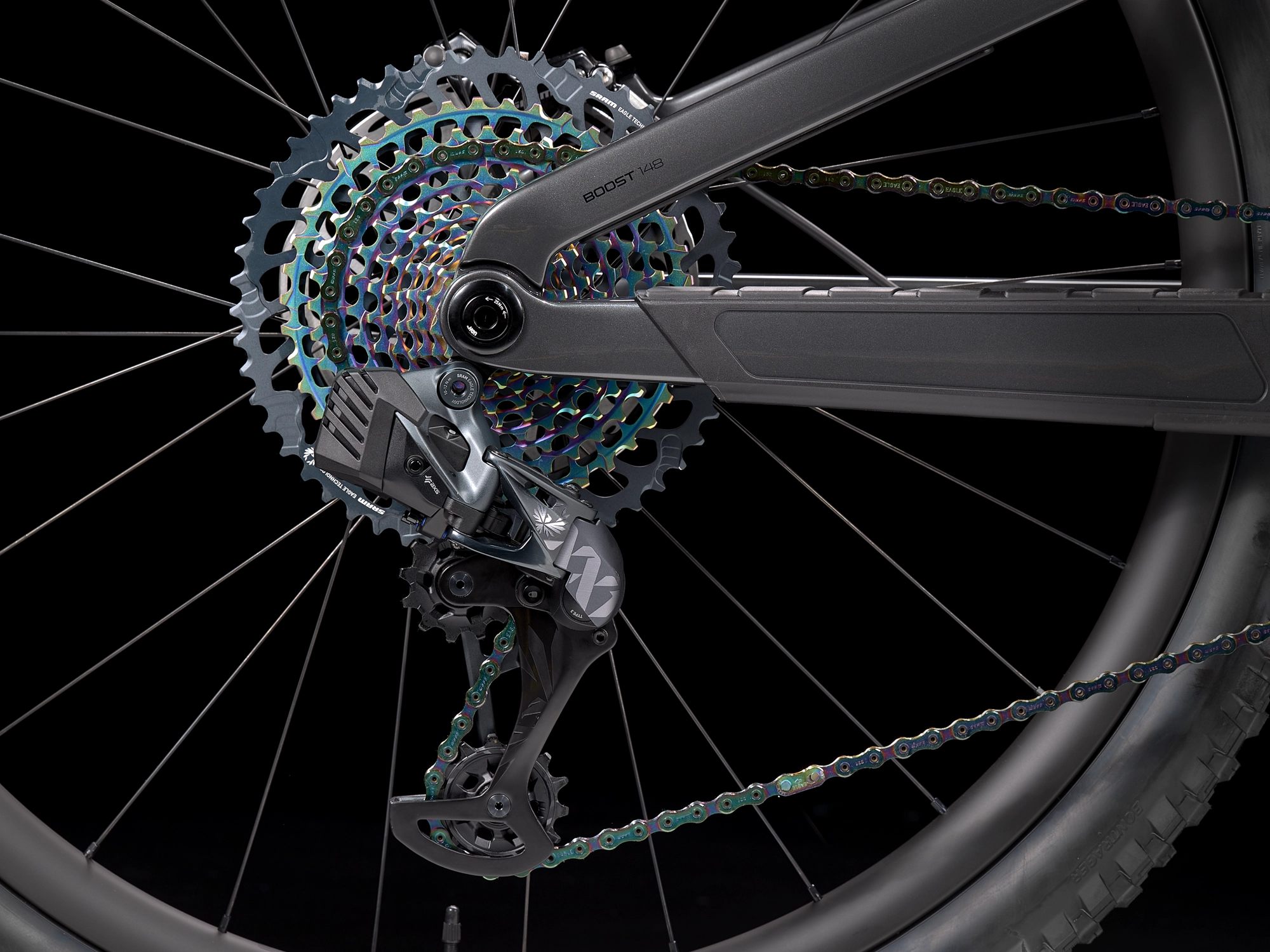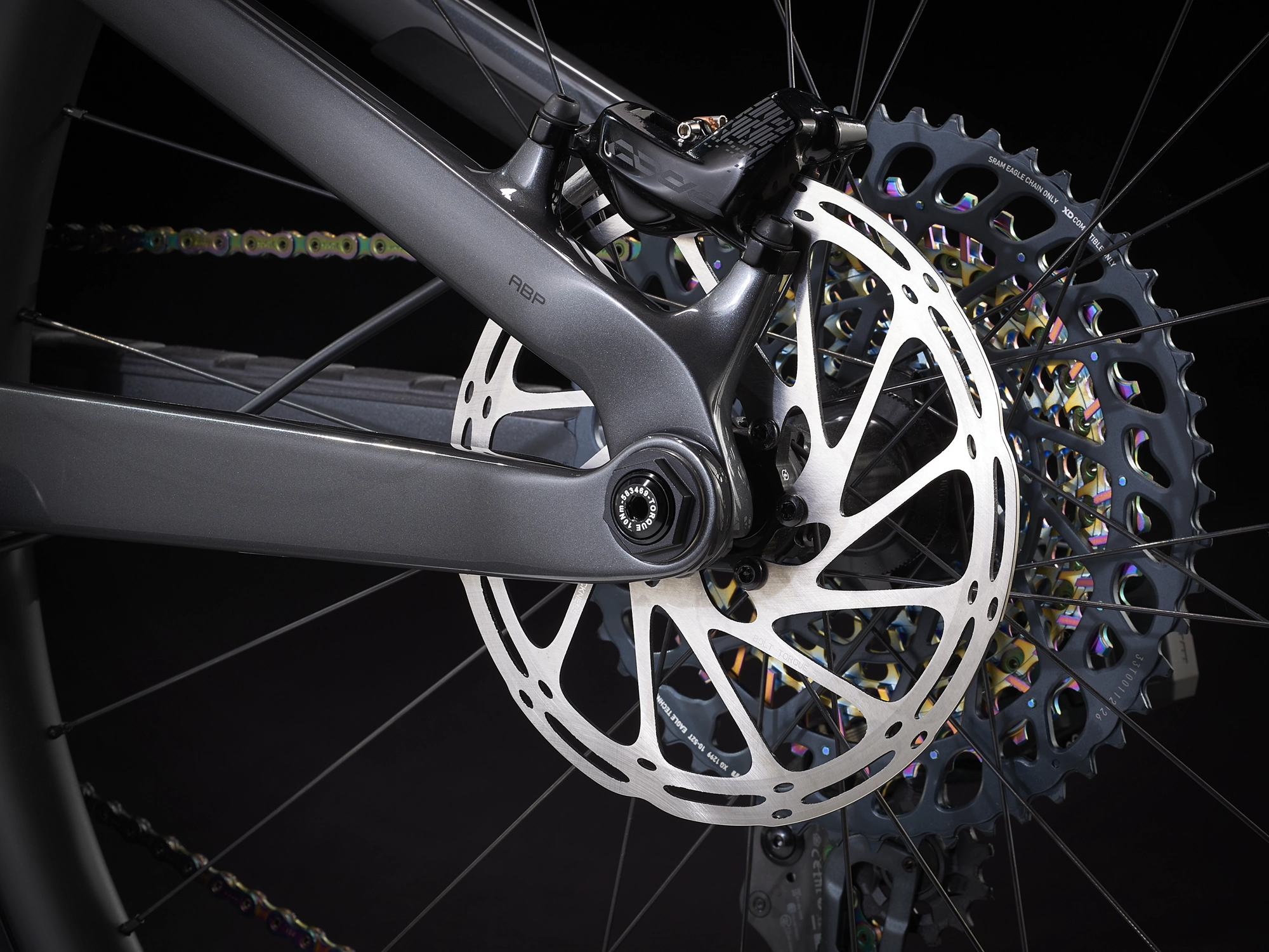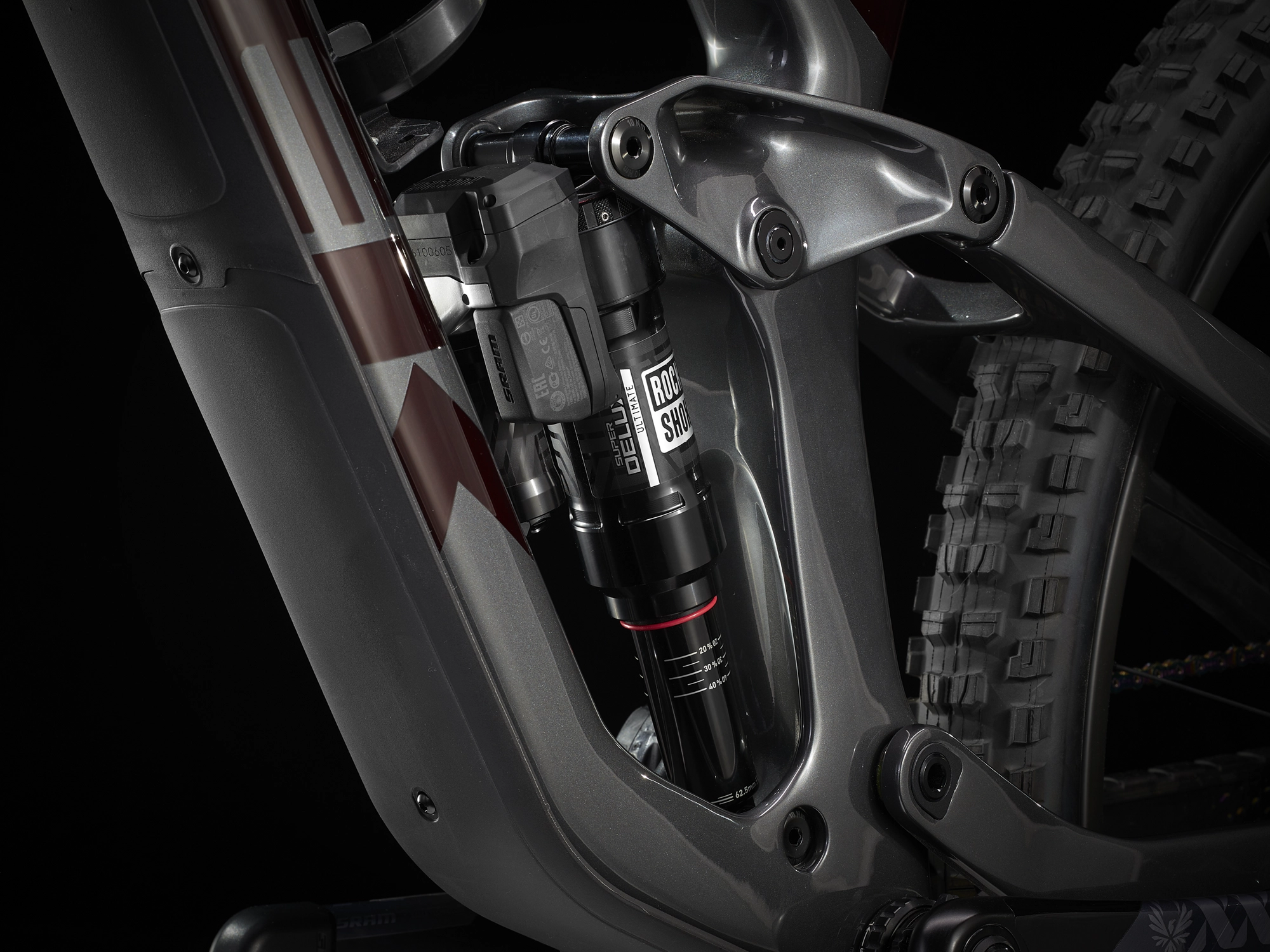Einen Rahmen aus OCLV Mountain Carbon mit 160 mm Federweg, einen RockShox Super Deluxe Ultimate Dämpfer mit überarbeiteter Thru Shaft-Dämpfung und eine RockShox ZEB Federgabel mit bulligen 38-mm-Standrohren. Dazu gibts eine drahtlose elektronische RockShox Flight Attendant-Dämpfersteuerung, die dein Fahrwerk „automagisch“ an das vorherrschende Terrain anpasst. Außerdem bekommst du einen drahtlosen elektronischen SRAM X01 Eagle AXS-Antrieb mit einer 10-52-Kassette, eine Reverb AXS Variosattelstütze, eine integrierte Bontrager RSL Lenker/Vorbau-Einheit und Bontrager Line Pro 30 Carbonlaufräder samt Rapid Drive-Nabe mit 108 Zähnen.