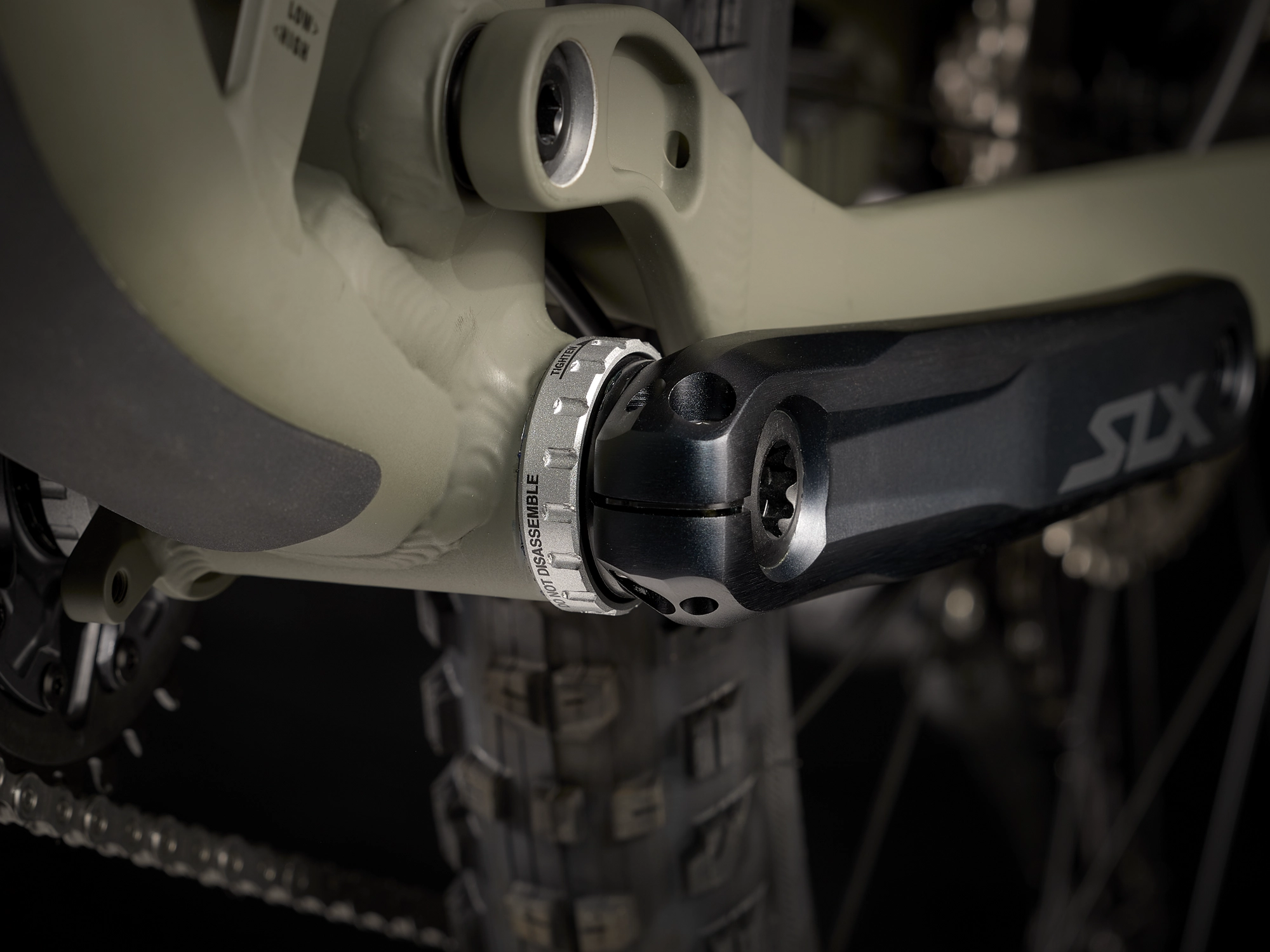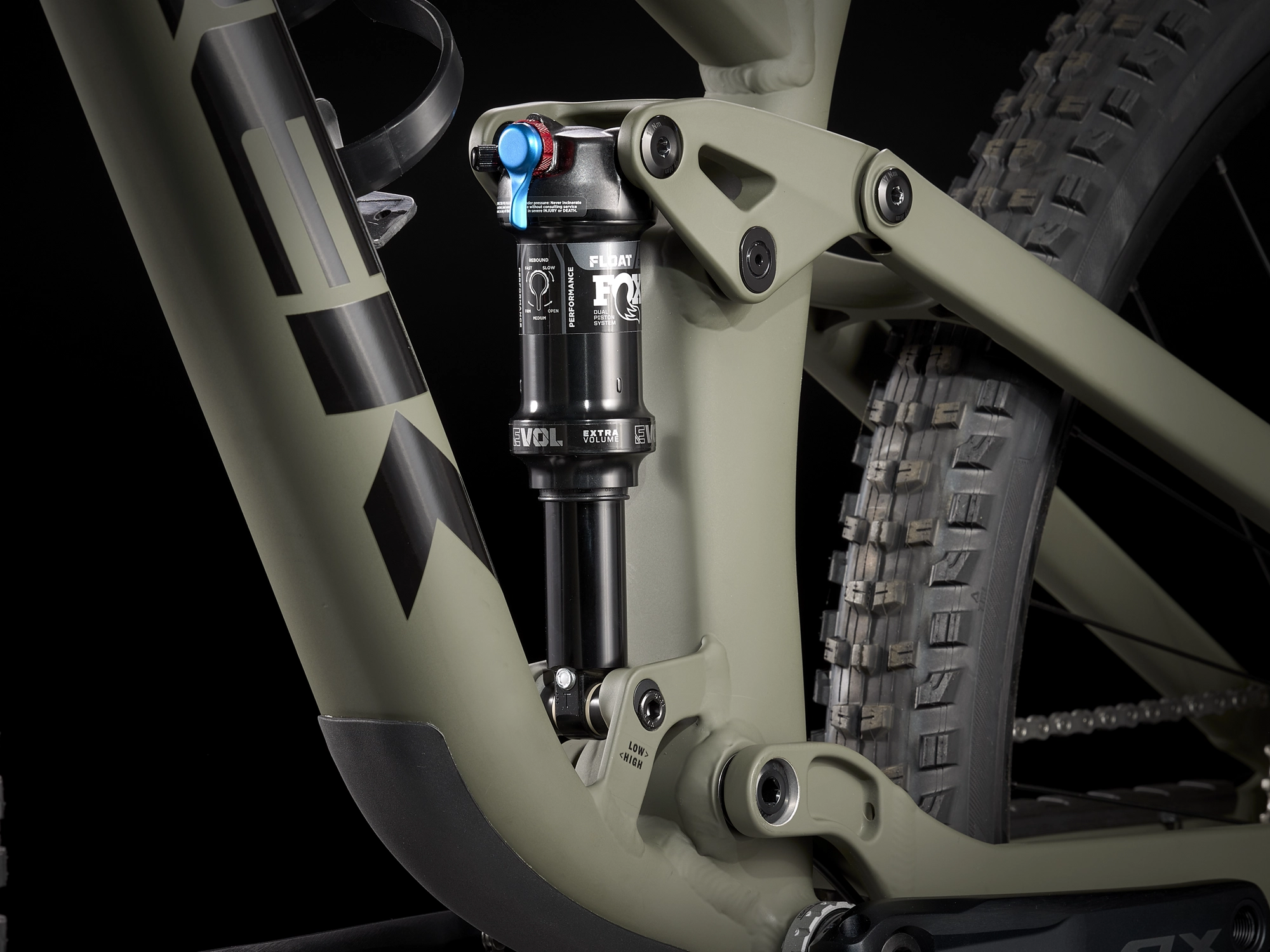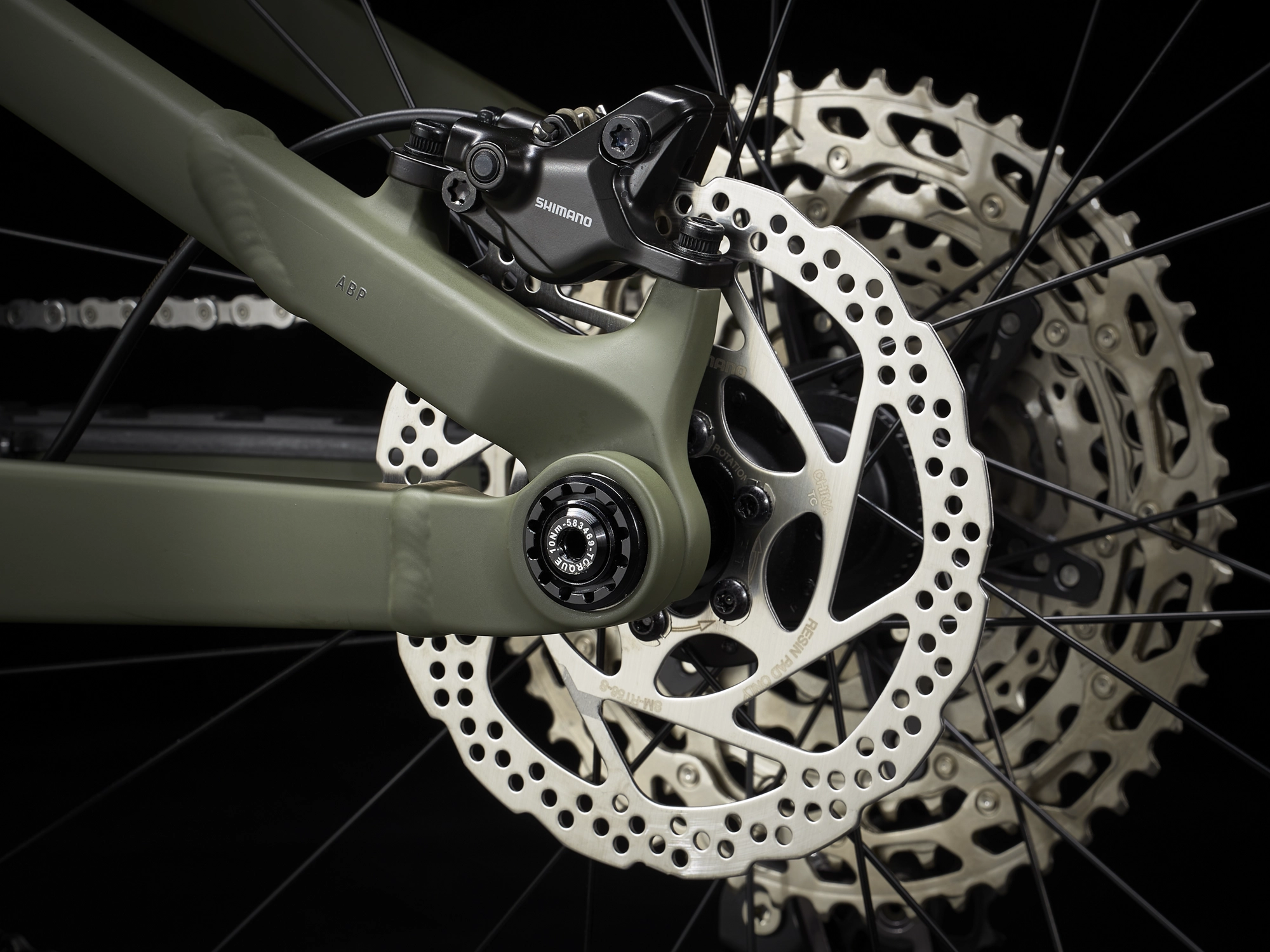 Einen leichten Aluminiumrahmen mit internem Staufach, eine RockShox 35 Gold-Gabel mit 130 mm Federweg, einen FOX Performance Float DPS-Dämpfer mit 3 Positionen und 120 mm Federweg und einen Shimano Deore/XT-Antrieb mit breitem Übersetzungsbereich. Dazu gibt’s Bontragers komplett schlauchlose Line Comp 30-Laufräder samt Dichtmittel, hydraulische Scheibenbremsen und eine Variosattelstütze.